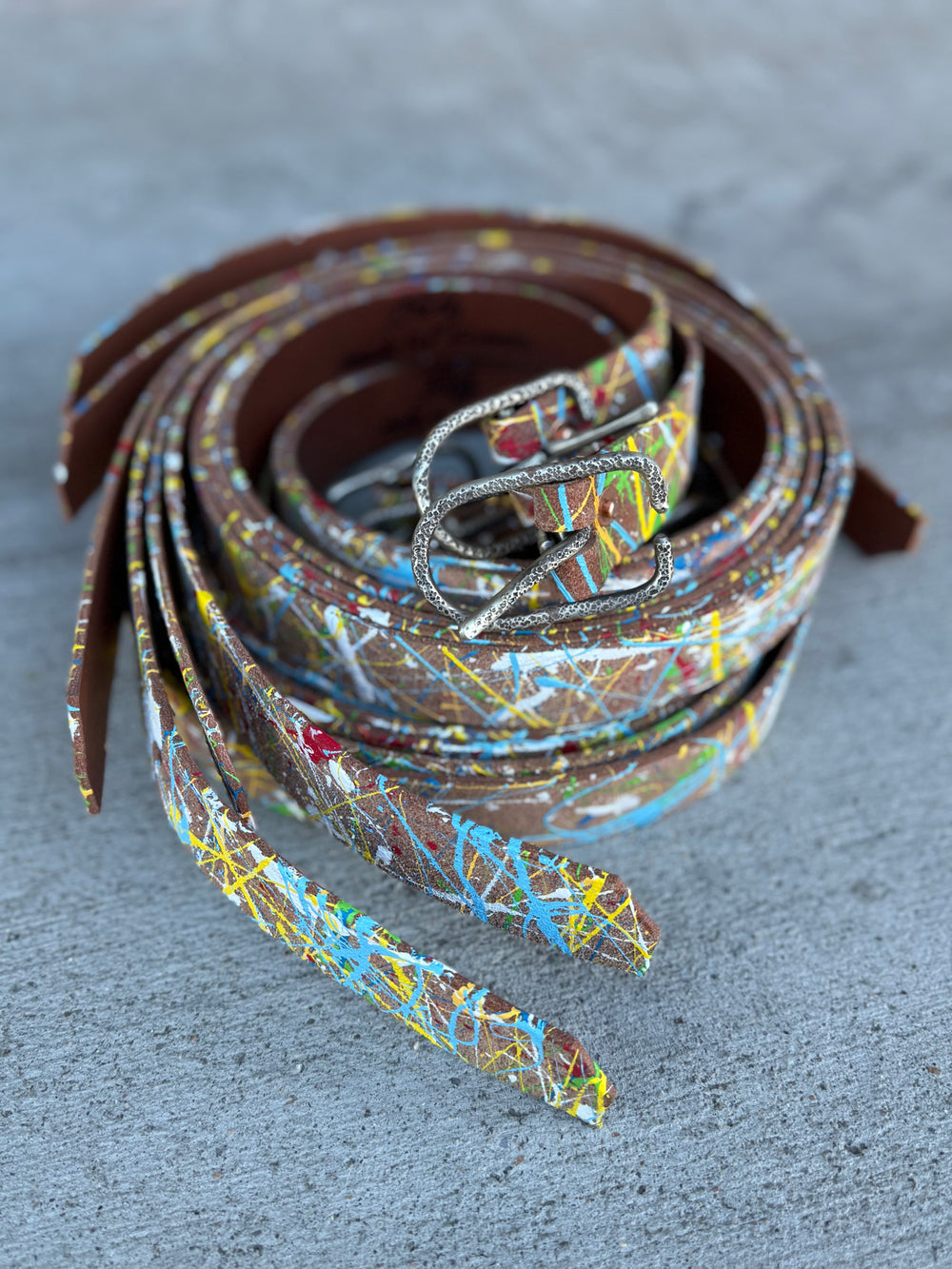 Each belt is hand splattered by Billy creating this one of a kind belt exclusively madefor Berkeley Supply. Hand hammered buckle.