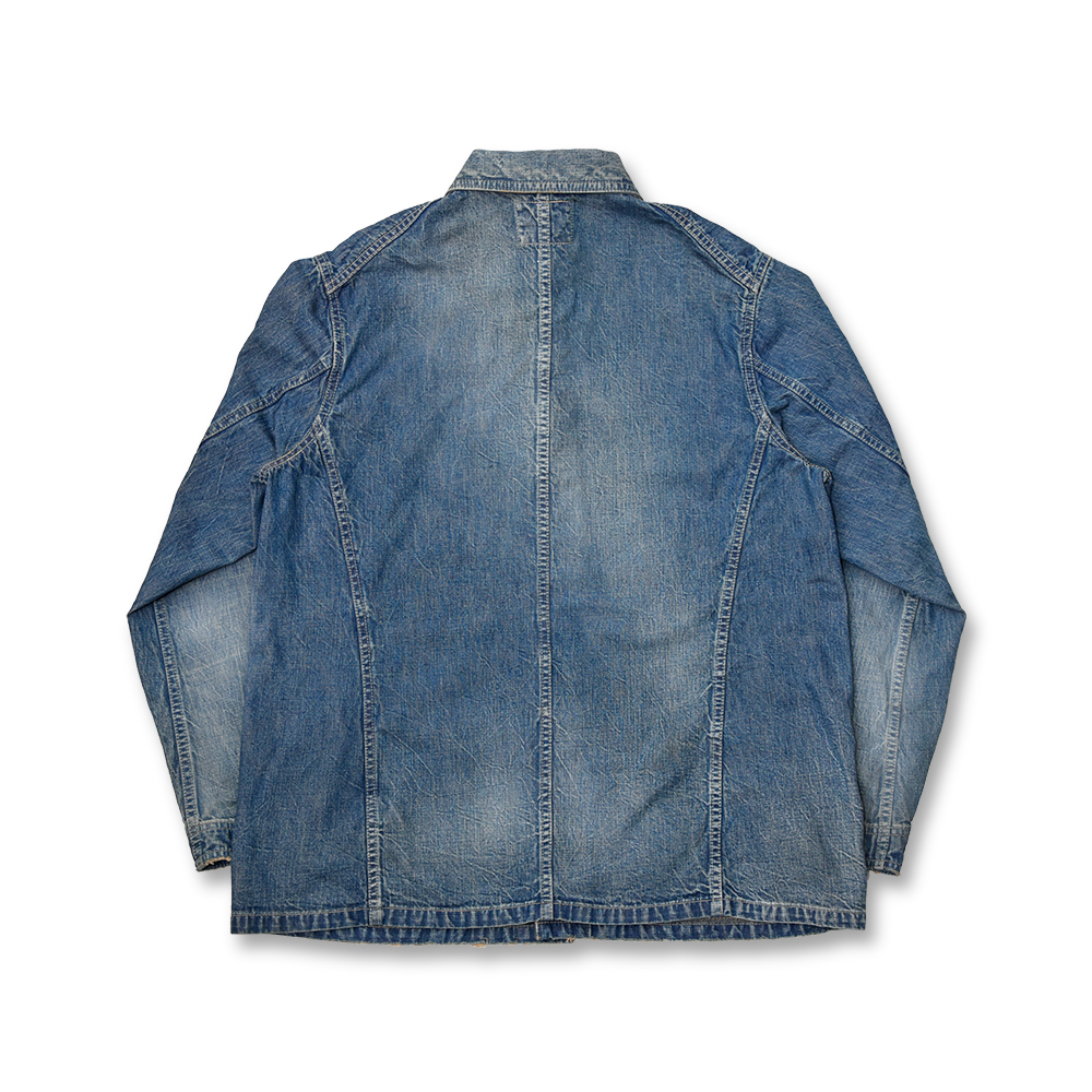 An updated version of the classic Denim Chore Jacket that has been processed to look like it’s already been worn as actual workwear for over 5 years. The faded color gives this jacket a rather rare and dry look.