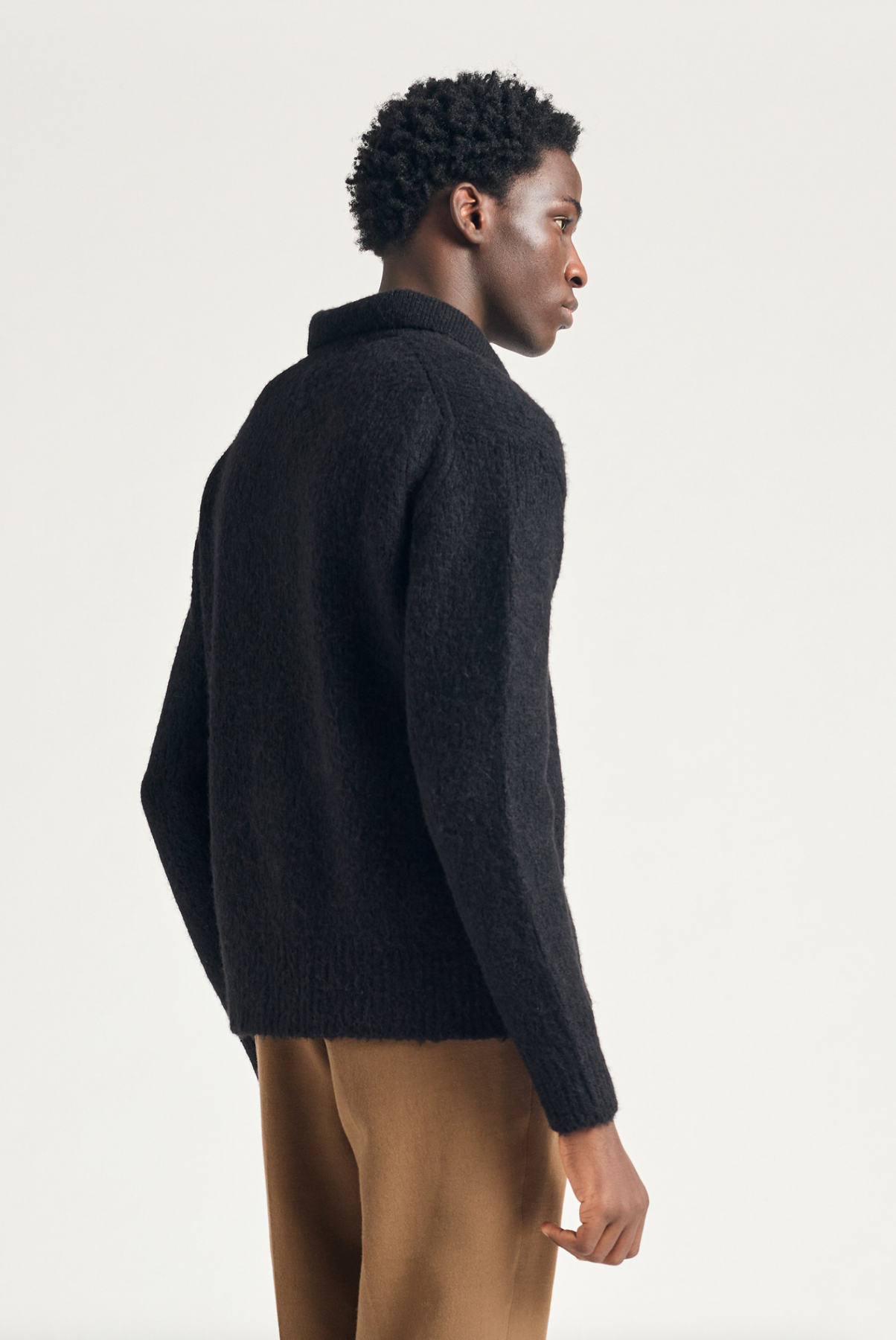 A polo knitted from an alpaca/wool blend in plain jersey. The relaxed fitting style is constructed with set-in sleeves, 2 button placket and finished with ribbed cuffs and hem.