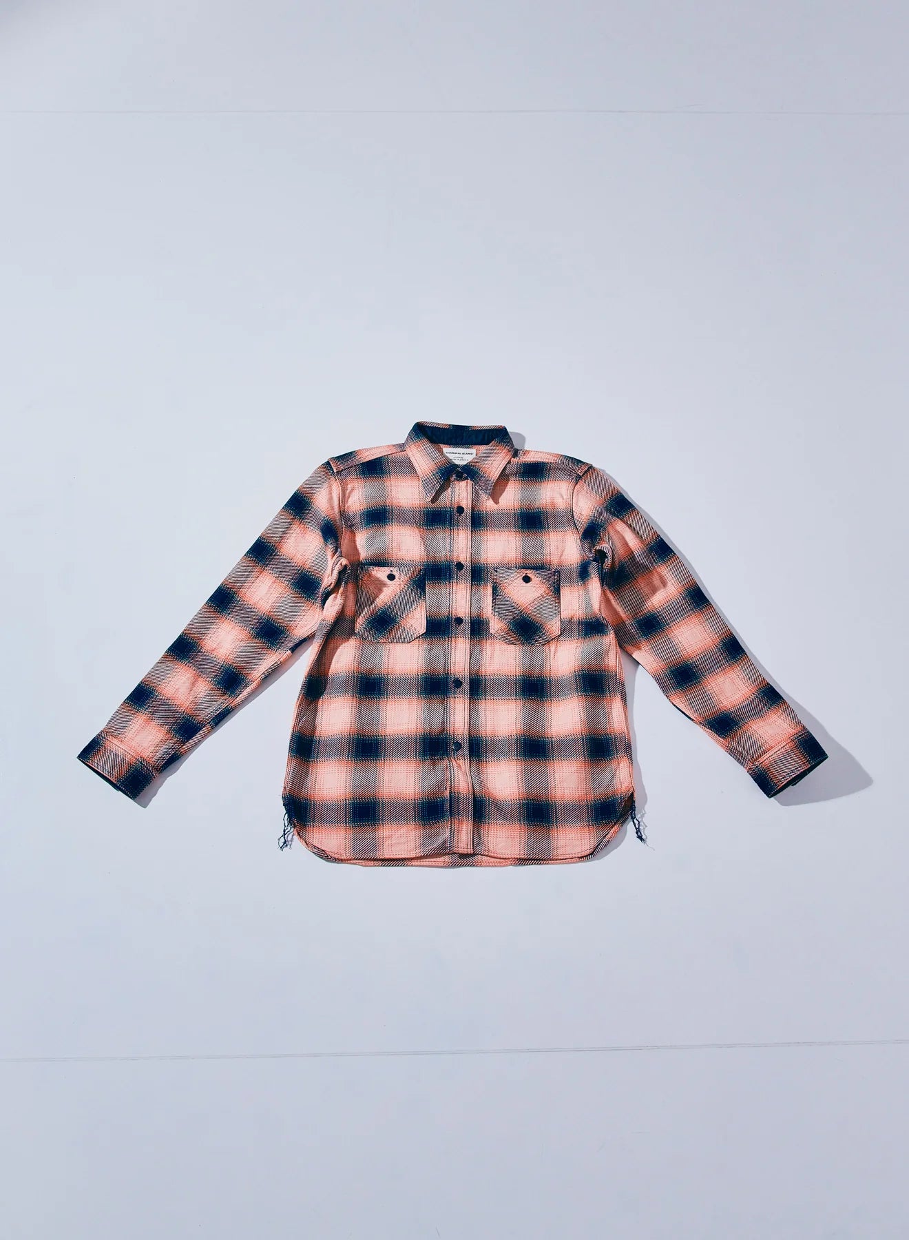 A work shirt made of original rope indigo heavy flannel fabric. The fabric is a heavy flannel check that combines the dark blue indigo rope-dyed thread that is normally used for denim with colored thread that is dyed with a special reaction dye that fades naturally. The fabric is a combination of a denim shirt and flannel and, although it is a shirt, it fades and changes over time like denim, yet still has the unique coloring of flannel.