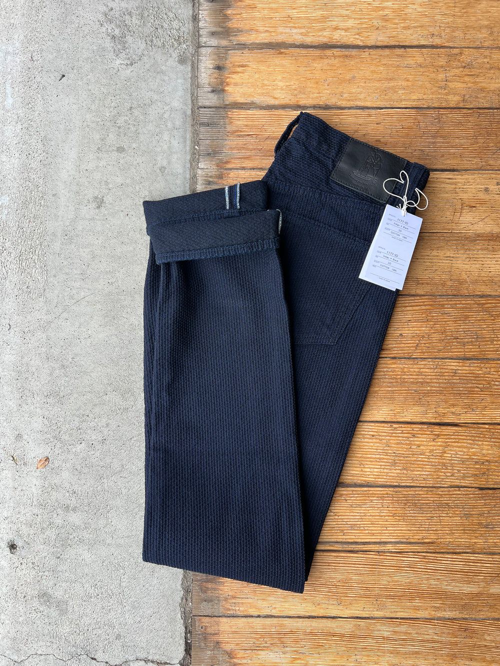 These pants are made with PBJ's original sashiko fabric, created using a uniquely modified loom. The base fabric is indigo, while the sashiko stitching is black. In contrast to the rugged sashiko used for kimono (bosu) and other garments, their sashiko fabric is lightweight at approximately 12 oz., resulting in a soft texture suitable for everyday wear. The base fabric is dyed with a sulfide dye, which tends to create fading, allowing for a gradual change in color with wear and washing. The silhouette features a high rise and a relaxed tapered silhouette that tapers neatly from the knee to the hem.